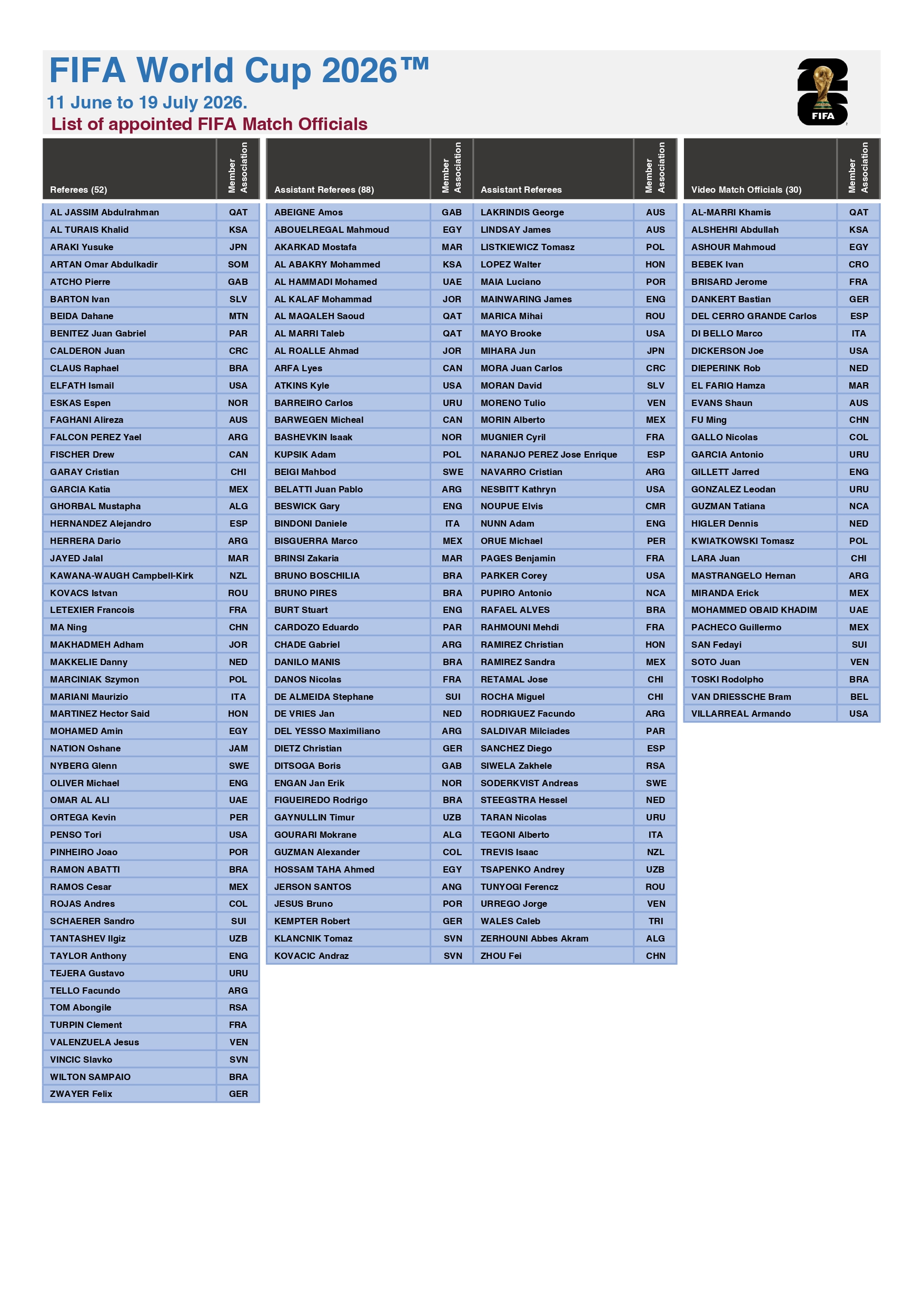 До фінального списку потрапили 52 головних арбітри, 88 асистентів і 30 відеоасистентів рефері. Вони представляють 50 національних асоціацій. ФІФА візьме на турнір представників усіх шести конфедерацій.