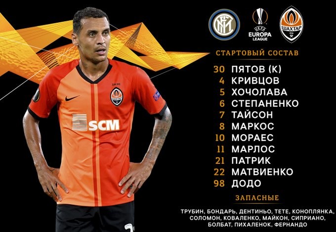 Повний стартовий склад «Шахтаря» виглядає так: Пятов - Додо, Кривцов, Хочолава, Матвієнко - Маркос Антоніо, Степаненко - Марлос, Алан Патрік, Тайсон – Мораес.