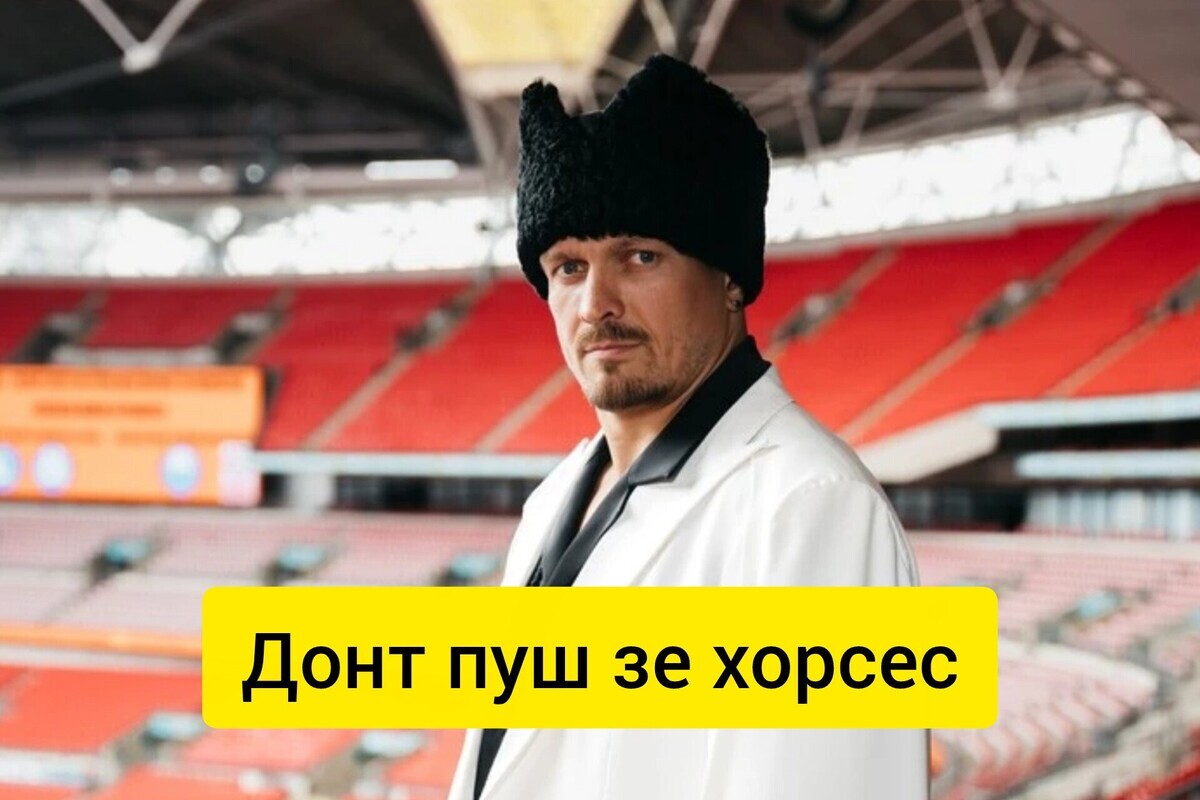 Також у мережі жартують з фрази Усика англійською «Don't push the horses», що в перекладі на українську означає «Не жени коней». Це словосполучення Олександра, яке він сказав на пресконференції, відразу набуло популярності.