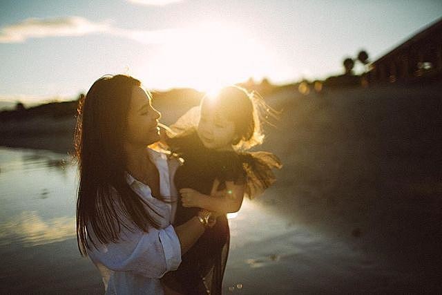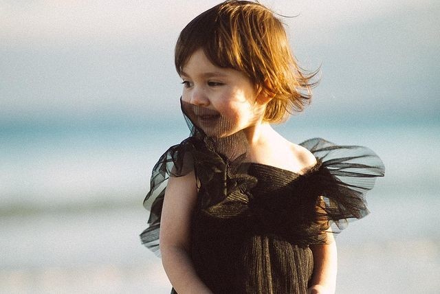 Дівчина одягнена в святкову сукню з фатину з пишною спідницею та рукавами-крильцями. Вона посміхається, на обличчя падає сонячне проміння, а її щаслива мама ловить дівчинку у свої обійми. Лілія і дочка зафіксовані на березі водойми, вони граються в сонці, ніби не помічаючи камер.