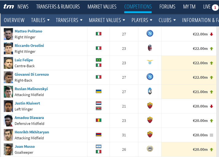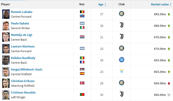Найціннішим гравцем Серії А став бельгійський форвард «Інтера» Ромелу Лукаку, трансферна вартість якого склала 85 млн євро. Слідом за ним розташувався аргентинський нападник «Ювентуса» Пауло Дібала (80) і ще один бомбардир з Аргентини Лаутаро Мартінес (70), що представляє «Інтер». Вартість Кріштіану Роналду склала 60 млн євро.