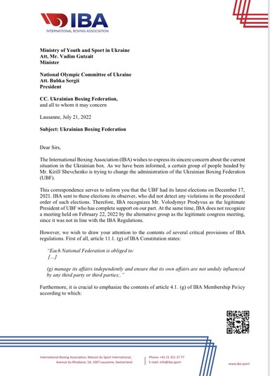 У листі IBA повідомляє, що останні легітимні вибори президента ФБУ відбулися 17 грудня 2021 року. Спостерігач від IBA був присутній на цих виборах і не виявив жодних порушень. «Тому IBA визнає Володимира Продивуса законним президентом ФБУ. При цьому IBA не визнає засідання, проведене 22 лютого 2022 альтернативною групою, як законне оскільки воно не відповідало Регламенту IBA», – йдеться в листі.
