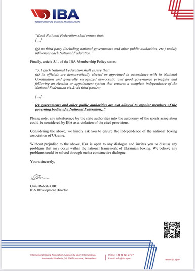 IBA також закликало керівництво Мінспорту Вадима Гутцайта і МОК Сергія Бубку не допустити втручання державних органів у автономію спортивної асоціації та забезпечити незалежність Національної федерації боксу України.