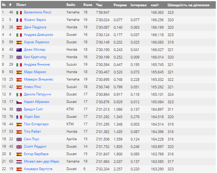 Педроса і Лоренсо посіли третє та четверте місця відповідно. Під кінець заїзду до п'ятої позиції поліпшився Андреа Довіціозо.