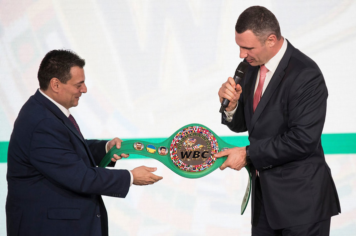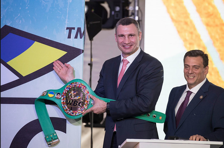 Перший такий пояс з українським прапором на передньому плані логотипу Маурісіо Сулейман вручив вічному чемпіону WBC Віталію Кличку.