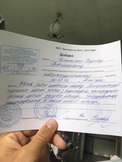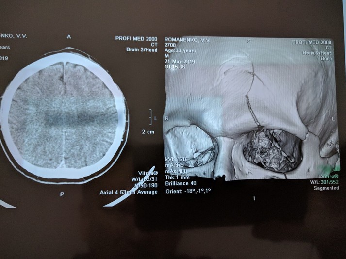 У потерілого забій головного мозку, тріщина лобової кістки черепа,зламаний ніс. Зі слів Вадима, є загроза витікання рідини, наразі проводяться консультації з лікарями інших клінік.