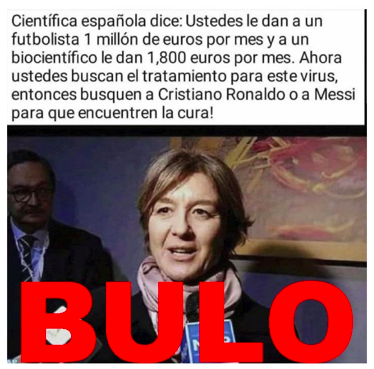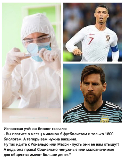 Вона звучить так: “Ви даєте мільйони євро на місяць футболістам та €1800 біологам. Нині вам треба вакціна. То йдіть до Роналду або Мессі, щоб знайти ліки”. Ця фраза припиусується безіменному іспанському біологу-науковцю та супроводжується фото літньої жінки.