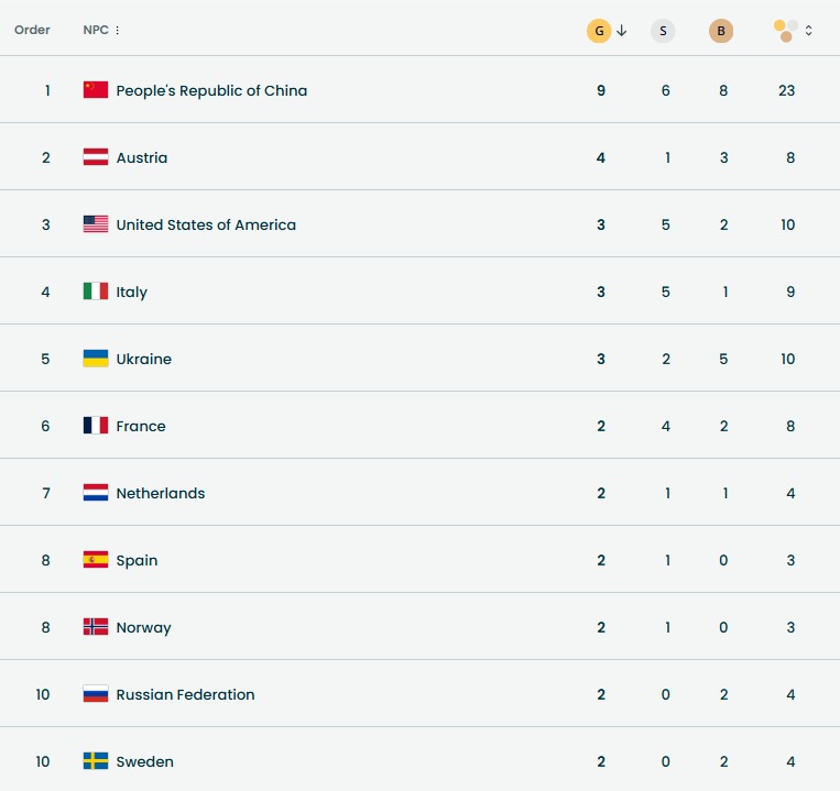 Після четвертого змагального дня до трійки увірвалася команда США завдяки двом золотим медалям у паралижних перегонах. Піднялася на другу позицію команда Австрії, натомість Україна опустилася на п'яте місце через відсутність медалей цього змагального дня. Натомість продовжують зміцнювати свої позиції Нідерланди та Іспанія, які тепер йдуть на сьомому та восьмому місці.
