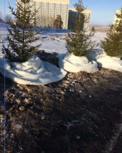 «Так як через відлигу сніг практично розтанув, то одна з функцій такого рішення – декоративна – закрити чорну землю і зробити зовнішній вигляд селища відповідним - зимовим. Дерева були висаджені восени. За відсутності снігу, коли вдарить мороз, вони можуть просто вимерзнути. Покривний матеріал допоможе їм достояти до весни», - пояснили в прес-службі СФУ.