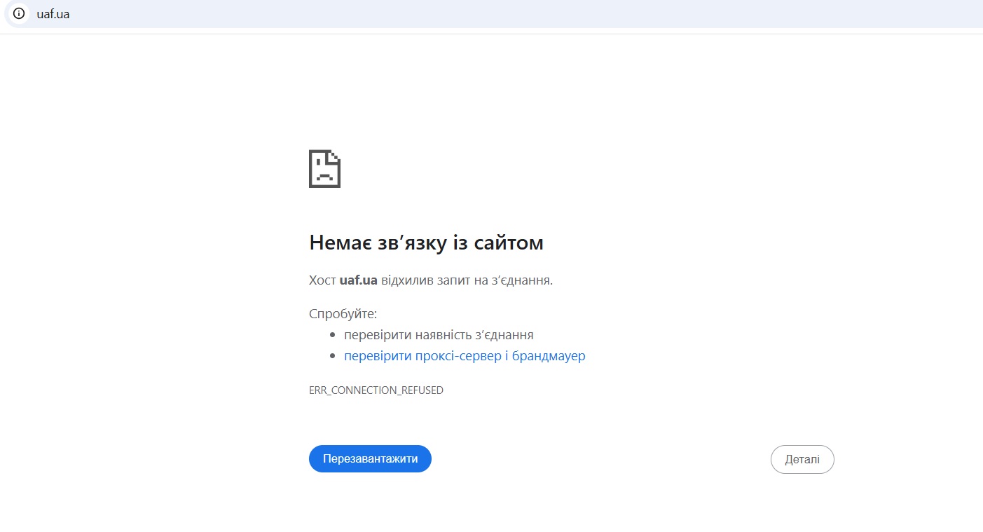 Наразі, станом на 10:15 13 березня 2026 року, сайт УАФ не працює.