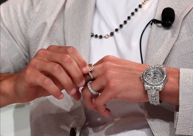 Журналісти відзначили на Кріштіану годинник Rolex з білого золота, усипаний діамантами, і два кільця - одне з яких з жовтуватим діамантом огранювання «принце» вартує 260 тисяч доларів.