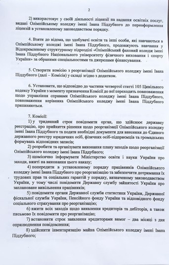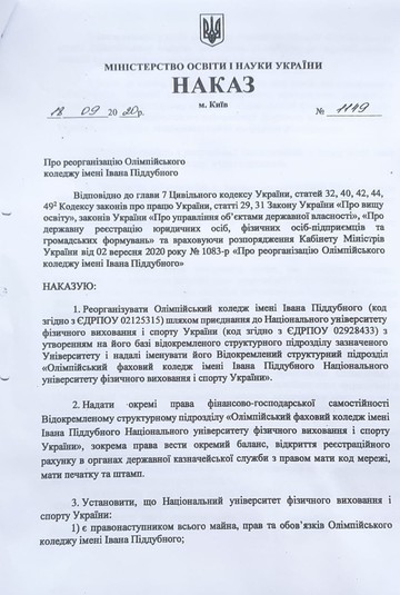 Такий висновок можна зробити з наказу т.в.о міністра від 18 вересня 2020 року, в якому зокрема вказується, що НУФВСУ є правонаступником всього майна, прав та обов’язків Олімпійського коледжу.