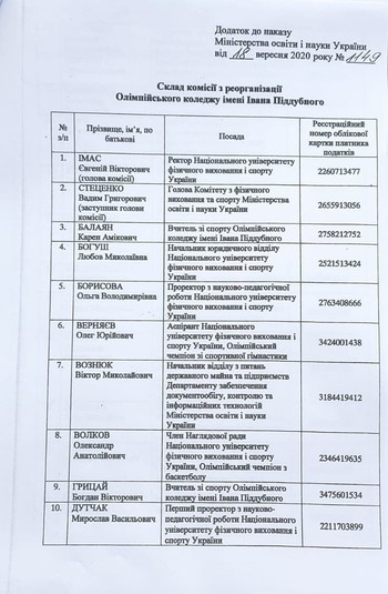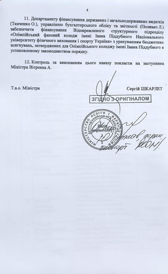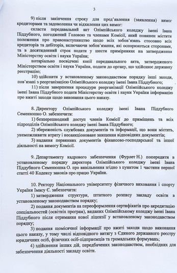 Також ректорові НУФВСУ Євгенію Імасу передаються права «затвердження структури, штатного розпису закладу освіти в установленому законодавством порядку». Натомість департаментові кадрового забезпечення міністр наказує «попередити в установленому порядку директора Олімпійського коледжу Семенюшка про звільнення (в оригіналі – вивільнення) згідно з пунктом 1 частини першої статті 40 Кодексу Законів про працю».
