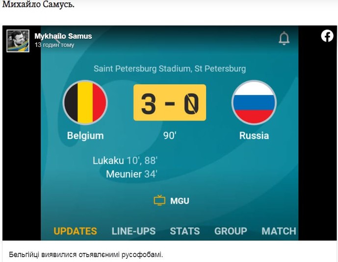 Ще кілька днів тому в Росії слиною бризкали в бік України з приводу напису на футболках 100-річних привітань «Слава Україні!» і «Героям слава!», а тепер, коли вболівальники згуртувалися навколо нашої збірної, кричать, щоб їх не соромили за красиву перемогу Бельгії над їхньою збірною.
