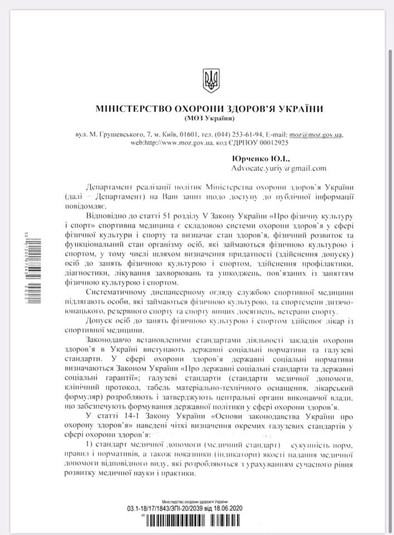 «Відповіді МОЗ, як завжди, феєричні. А ви там помирайте, спортсмени. Це дивно, особливо з урахуванням, що змагання відбувалися під час карантину», - прокоментував отриманого за підписом Директора департаменту реалізації політик МОХ Гаврилюка листа пан Юрченко.