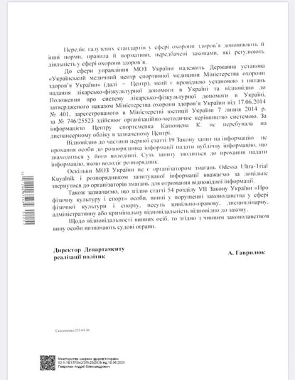 Спортивний юрист Юрій Юрченко отримав від Міністерства охорони здоров’я України відповідь на свій запит щодо смерть 31-річної атлетки Катерини Катющевої, котра померла в наслідок отриманого інсульту під час надмарафону Odesa Ultra-Trial Kuyalnik.
