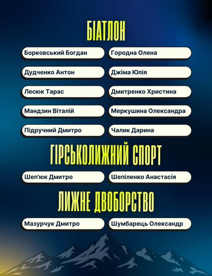 - Біатлон: Богдан Борковський, Антон Дудченко, Тарас Лесюк, Віталій Мандзин, Дмитро Підручний, Олена Городна, Юлія Джима, Христина Дмитренко, Олександра Меркушина, Дарина Чалик