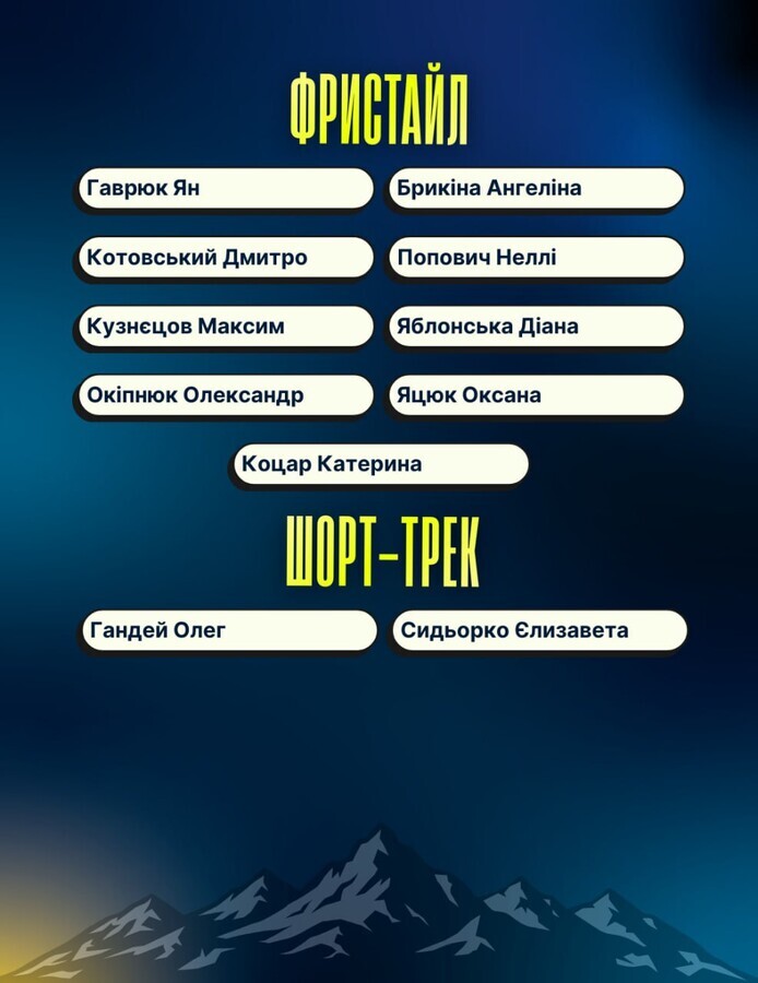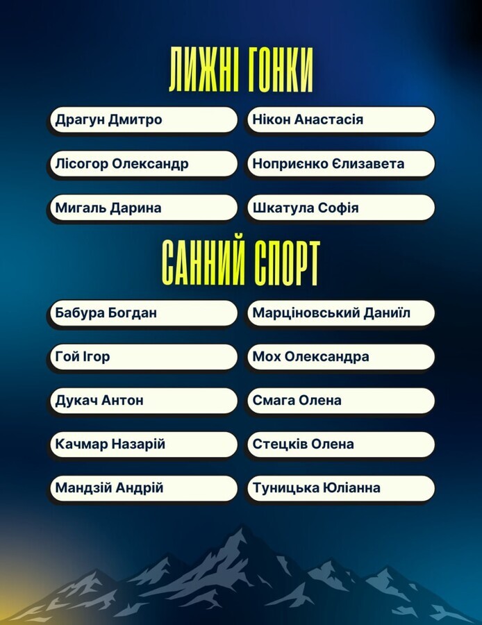 - Лижні гонки: Дмитро Драгун, Олександр Лісогор, Дарина Мигаль, Анастасія Нікон, Єлизавета Ноприєнко, Софія Шкатула