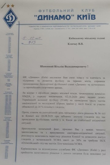 Власник київського «Динамо» Ігор Суркіс звернувся до мера столиці Віталія Кличка з проханням надати дозвіл на часткову присутність глядачів на матчах Ліги чемпіонів. Ігор Михайлович підкреслив, що найближчим часом, 10 і 13 жовтня, з 30-відсотковою відвідуваністю відбудуться матчі збірної України у рамках Ліги націй проти німців та іспанців.