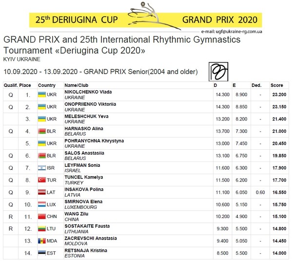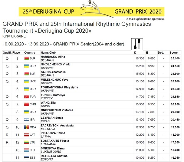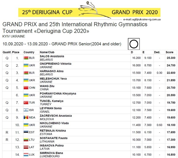 Четверте місце в багатоборстві посіла українська грація, чемпіонка Всесвітньої Універсіади Єва Мелещук, яка показала найкращий результат з м'ячем, третій - зі стрічкою і четверті - з обручем і булавами.