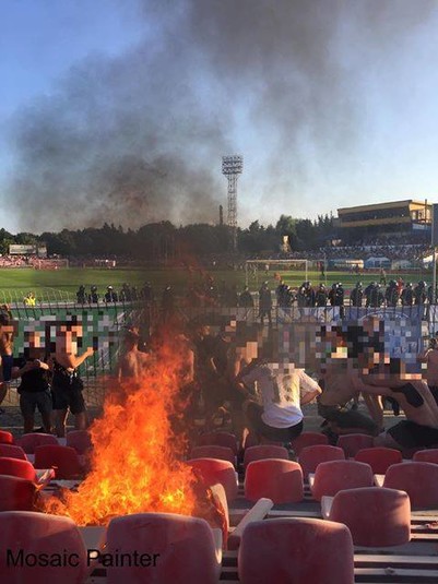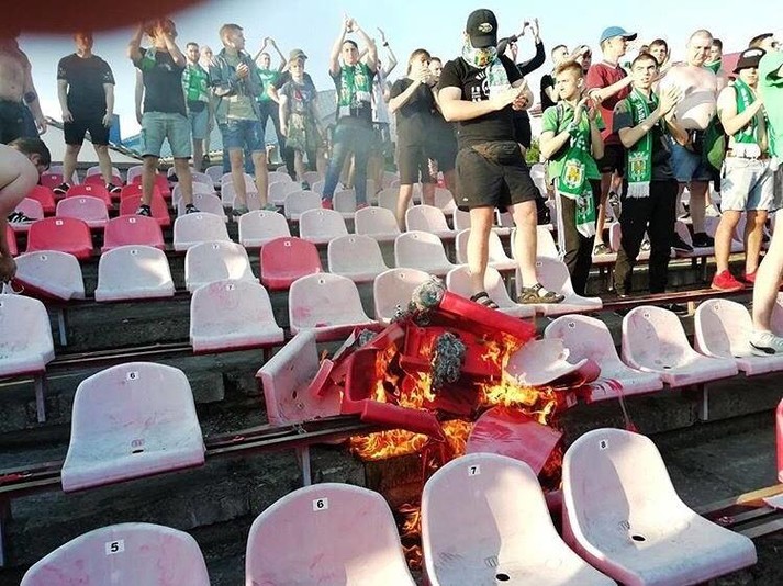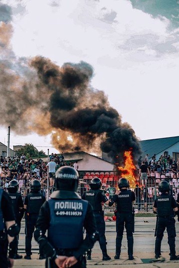 Не були білими і пухнастими впродовж цієї зустрічі і галицькі ультрас. Вони теж палили піротехніку, у них теж виникали сутички з поліцією. Проте головним наслідком стала спалена майже повністю трибуна стадіону «Авангард». Фото з відкритих джерел демонструють, що займання трапилося не випадково. Іронія полягає у тому, що крісла вигоріли у формі сердечка.
