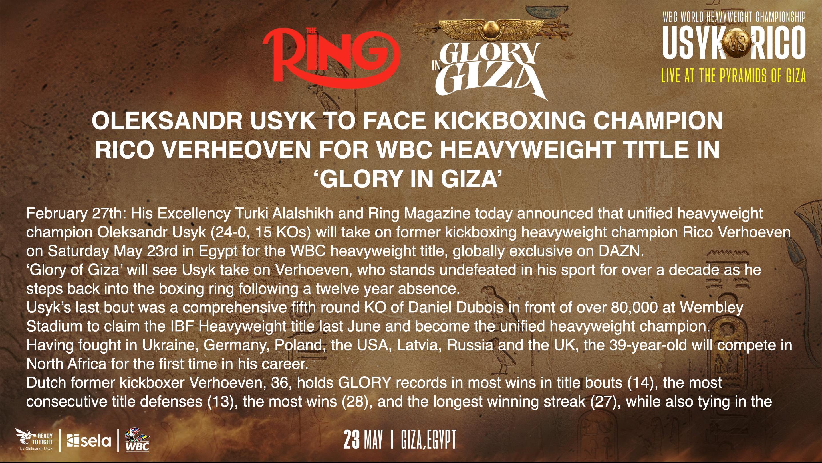 Чемпіон WBC, WBA та IBF у надважкій вазі Олександр Усик проведе бій проти нідерландського кікбоксера Ріко Верховена. Поєдинок запланували на 23 травня в Гізі, Єгипет. Про це повідомляє «Главком»