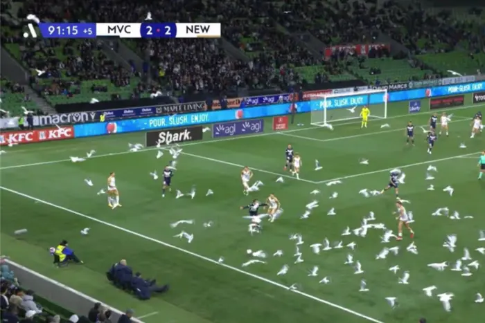 Під час матчу 25-го туру австралійської А-Ліги між «Мельбурн Вікторі» та «Ньюкасл Джетс» на останніх хвилинах поєдинку стадіон AAMI Park став ареною для масового «десанту» чайок, що ледь не зірвав фінальний штурм гостей. Про це повідомляє «Главком».