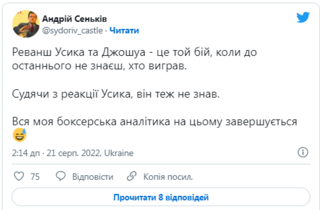 «Друзі! Слава Україні! Слава її героям! Людям, які прославляють Україну. Ми продовжуємо доводити, що можемо перемагати – і в спорті, і на полі бою. І перемагаємо! Дякую Олександру Усику за перемогу в такому складному поєдинку! Дякую Ентоні Джошуа за гідність справжнього спортсмена. Україна – сильна держава. Ми переможемо і російських варварів! Слава вільній і гідній Україні!», – відреагував мер Києва Володимир Кличко.