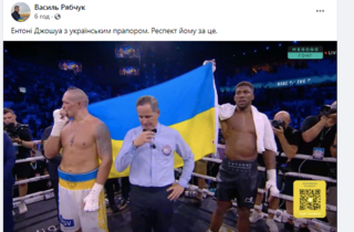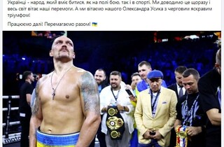 «Україна перемагає!!! Олександр Усик захищає чемпіонські пояси за версією WBA, WBO, IBF та IBO у бою-реванші з Ентоні Джошуа! Козацький дух і особлива сила «Червоної калини», яку Усик співав напередодні бою, – непереможні! Чемпіоне, вітаю! Чудовий подарунок всій країні до прийдешнього Дня Незалежності! Слава Героям! Слава Збройним силам України, які наближають нашу перемогу на полі бою! Слава Україні!», – написав президент УАФ Андрій Павелко.