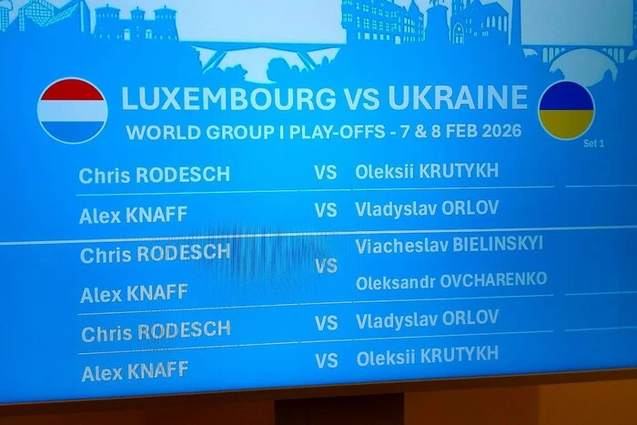 Сьогодні, 6 лютого 2026 року, відбулося жеребкування матчів у поєдинку плейоф за вихід до Першої Світової групи Кубку Девіса між командами Люксембургу та України. Про це повідомляє «Главком».