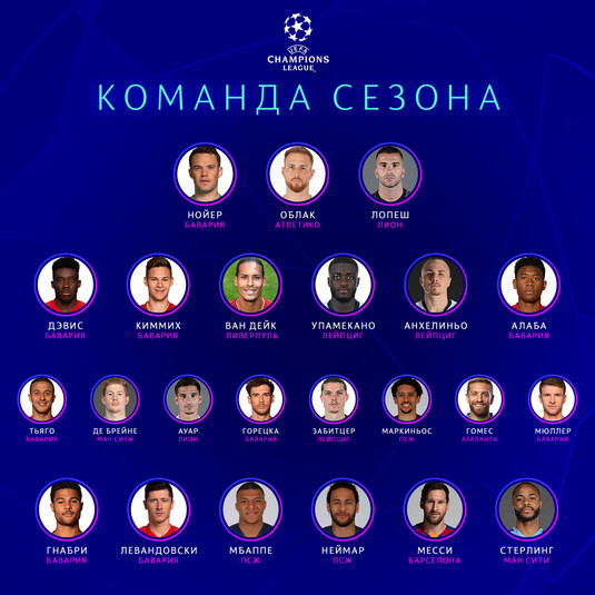 УЄФА оголосив символічну збірну сезону-2019/2020 за підсумками виступів футболістів у Лізі чемпіонів.