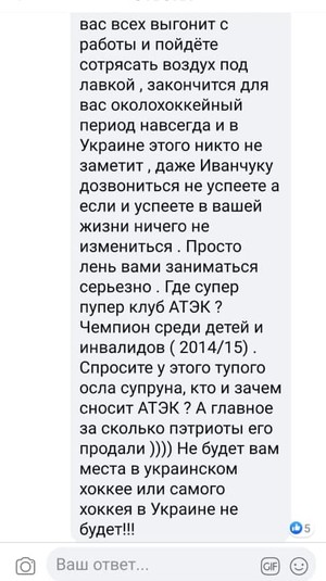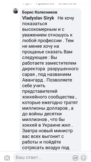 Пан Супрун теж у боргу не залишився: «Один з головних сепаратистів України Колесніков у всій своїй красі. Мужності писати та відповідати у «Хокейній спільноті» в нього забракло, він видалив та заблокував мене, хлопців-хокеїстів, які писали йому правду. Сепаре, ти можеш тільки помріяти про таку команду, як АТЕК-2014/2015! Хлопці грали безкоштовно, не за мене, а за свою улюблену справу і стали чемпіонами. Тобі таке тільки в яскравих снах приходить. Мільйони витрачаєш? Розкажи про мільярди, які ти вкрав з Яником. Та продовжуй далі бризкати піною, сепаре».