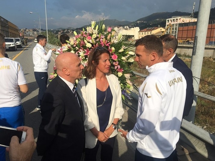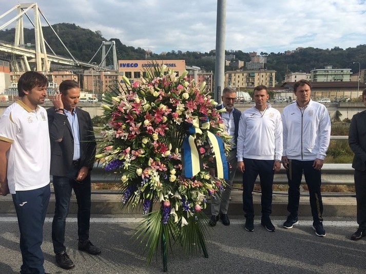 Збірна України вшанувала пам'ять загиблих у Генуї, поклавши квіти до підніжжя мосту. Фото