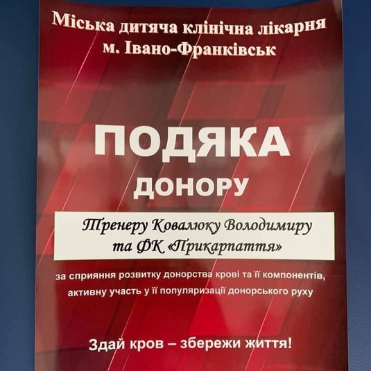 Футболісти і тренери першолігового футбольного клубу «Прикарпаття» з Івано-Франківська завітали сьогодні, 12 вересня, вранці в місцеву обласну станцію переливання крові, щоб здати кров для міської дитячої клінічної лікарні.