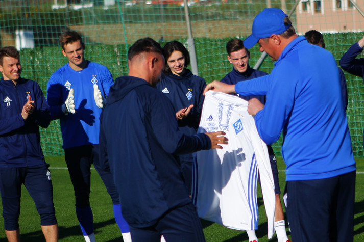 Ранкове заняття динамівців розпочалося з привітань Миколи Морозюка з Днем народження. Традиційний подарунок – футболка з автографами гравців команди з рук головного тренера.