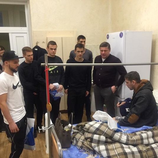 Зокрема, до госпіталю прийшли Максим Коваль, Євген Хачеріді, Микола Морозюк, Віктор Циганков, Володимир Шепелєв і тренер Олег Лужний.
