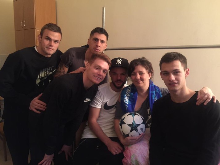Гравці футбольного клубу «Динамо» завітали до поранених воїнів АТО в одному зі шпиталів, принесли їм м'ячі з автографами, шарфи, футболки та продукти.