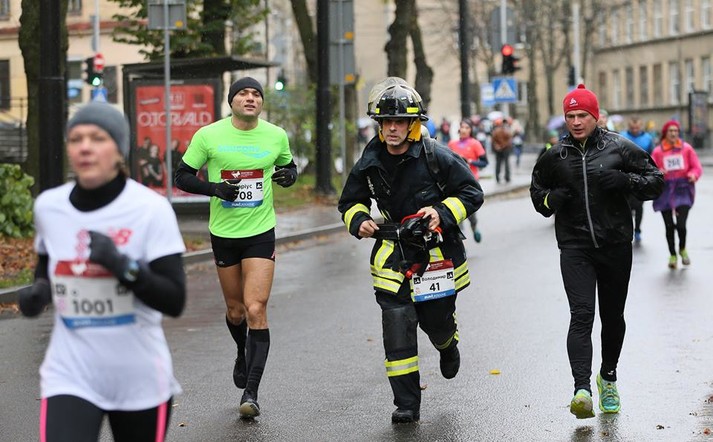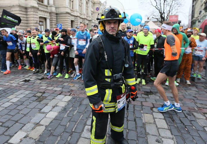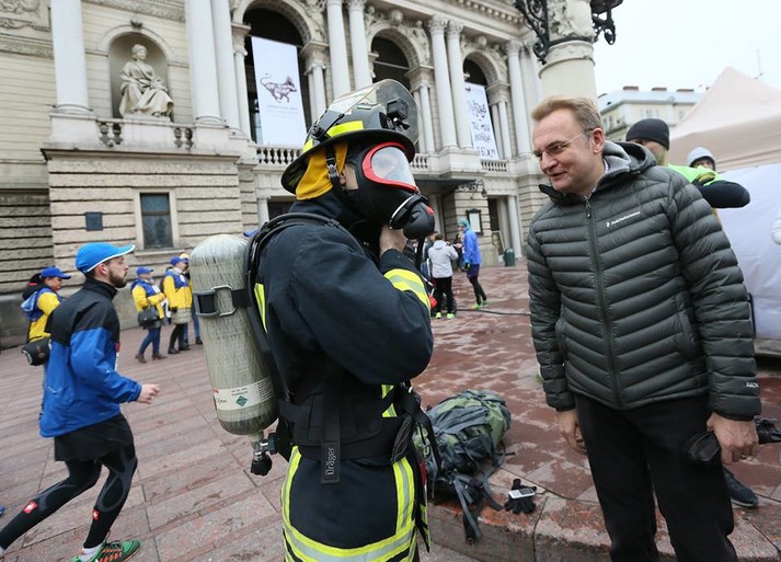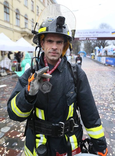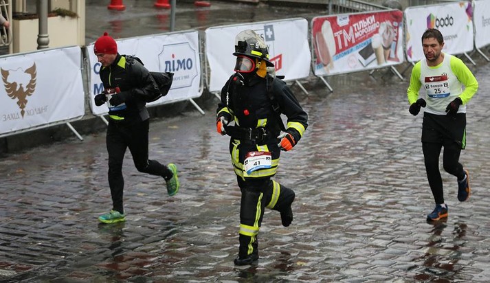 Феноменальний рекорд встановив рятівник з столиці Володимир Сковорода, який подолав дистанцію в повному спорядженні пожежного – у спец костюмі з вогнетривкого матеріалу (включаючи чоботи, в рукавицях, шоломі та з балонами з киснем за спиною).