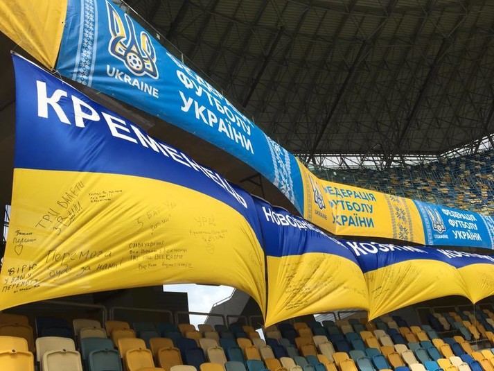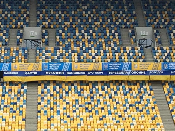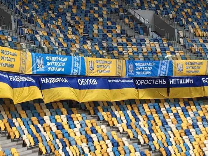 Уболівальники, які зібралися на площі перед стадіоном, перед початком матчу прикрасили порожні трибуни «Арени-Львів» українськими прапорами з назвами великих і малих українських міст.