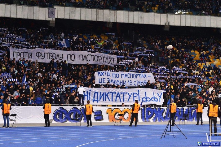 Також фанати підняли банери, які вже показували у попередніх матчах: «Ні - диктатурі ФФУ», «Проти футболу по паспортах» і «Вхід по паспортах – це закони 16 січня».