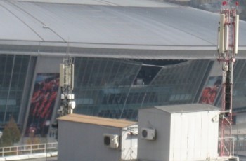 Напомним, что ранее осколками была повреждена северо-восточная часть фасада стадиона.