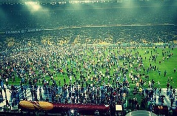 После победы днепропетровского «Днепра» в ответном матче полуфинала Лиги Европы над «Наполи» фанаты украинской команды выбежали на поле НСК «Олимпийский» и вместе с празднованием исторического достижения устроили беспорядки.