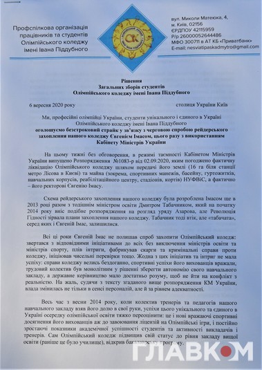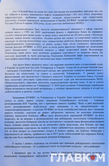 «Я акцентував увагу членів комісії на тому, що Закон «Про бюджет», стаття 24, передбачає передачу нашого навчального закладу в комунальну власність на термін з 2018-го по 2021 роки, - доповнює директор Олімпійського коледжу Олексій Семенюшко. – У жовтні 2018 року Київрада проголосувала, щоб прийняти нас у комунальну власність. Відповідно Кабмін має виконати цю норму закону і провести відповідні процедури. Замість того Кабмін намагається зобов’язати здійснювати протягом 2020-2024 років здійснювати фінансування «фахового коледжу Національного університету фізкультури і спорту» з державного бюджету та бюджету міста Києва. Цікаво, на яких підставах уряд має право втручатися в бюджет територіальної громади? Зрозуміло, що Київ платити за не свою власність не буде. Це призведе до того, що фінансування нашого вищого освітнього закладу припиниться. І фактично припиниться фінансування загальноосвітньої школи-інтернату. А Імасу тільки те й потрібно, щоб заклад припинив функціонувати і була змога вільно розпоряджатися землею так, як вони планують. Усі ці перешкоди роботі коледжу чиняться вже сьомий рік».
