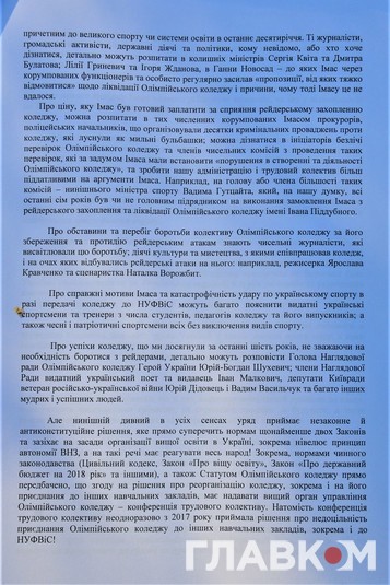 Виконувач обов’язків міністра переконаний, що керівництво Олімпійського коледжу лукавить. «Ви кажете, що не зможете готувати спортсменів, – сказав урядовець, звертаючись до представників закладу. – Але це неправда. У вас окрема бюджетна програма. Ви відокремлений підрозділ. Земля, майно є власністю держави. Без державного рішення, без Фонду держмайна, без вашої згоди нікому земля не відійде. Вам ніхто не заважає готувати спортсменів. Я не готовий сказати за уряд, що розпорядження буде скасоване, але готовий зустрічатися з колективом, спортсменами, тренерами».
