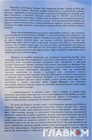 «Такі вимоги – не утопія, – переконує «Главком» викладач коледжу, чинний борець вільного стилю Богдан Грицай. – Кілька тижнів тому проти Шкарлета мітингували студенти різних вузів. Ми об’єднаємо з ними свої зусилля. Не хочеться, щоб за освіту в Україні відповідала людина некомпетентна аж настільки. А Гутцайт є випускником Олімпійського коледжу. Через те мені дивно, що Вадим Маркович з 2014 року, а також із тих часів, як він очолював Департамент молоді і спорту Київської міської держадміністрації, підтримував позицію рейдерів, був у складах відповідних комісій, приходив до нас разом із «тітушками». Тепер він є одним із ініціаторів реорганізації».