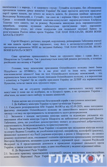 Незгоді з таким рішенням студенти коледжу оголосили страйк. Серед основних його вимог: відсторонення від обов’язків тимчасового виконувача обов’язків міністра освіти Сергія Шкарлета та міністра молоді і спорту Вадима Гутцайта.