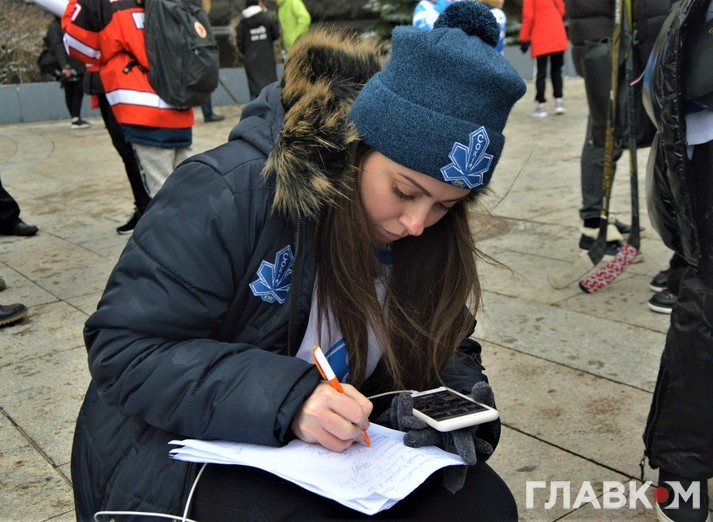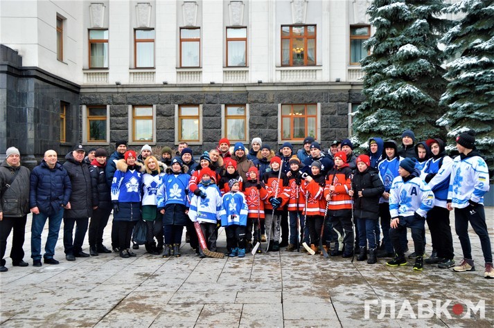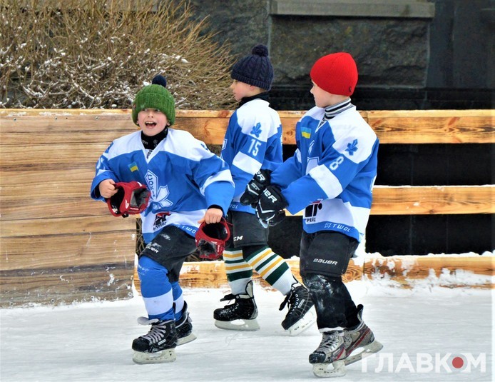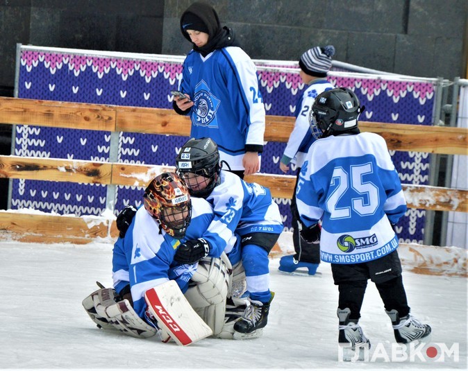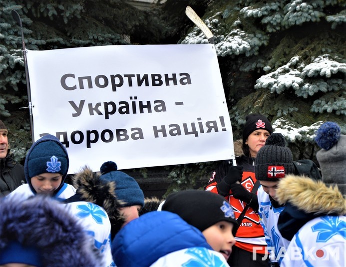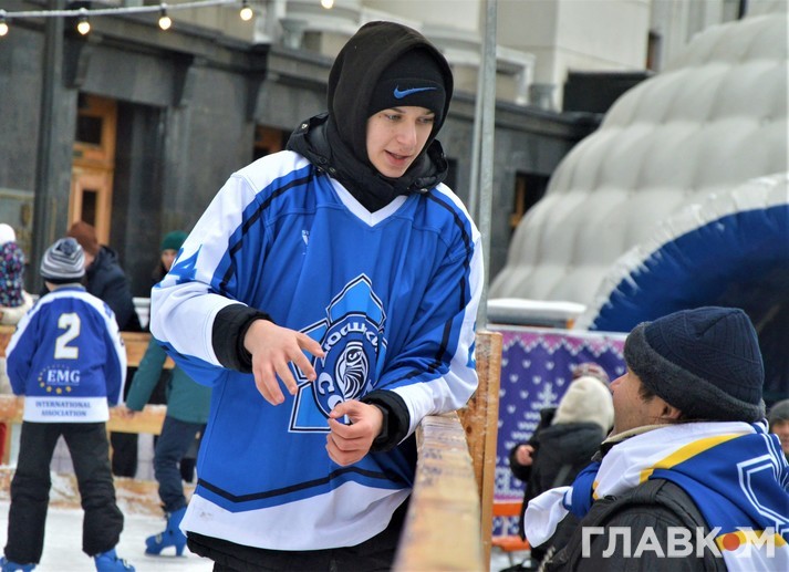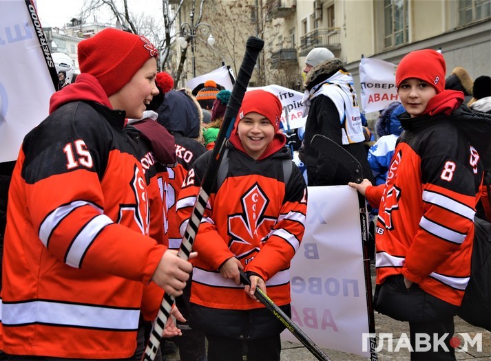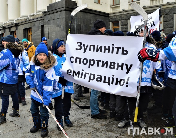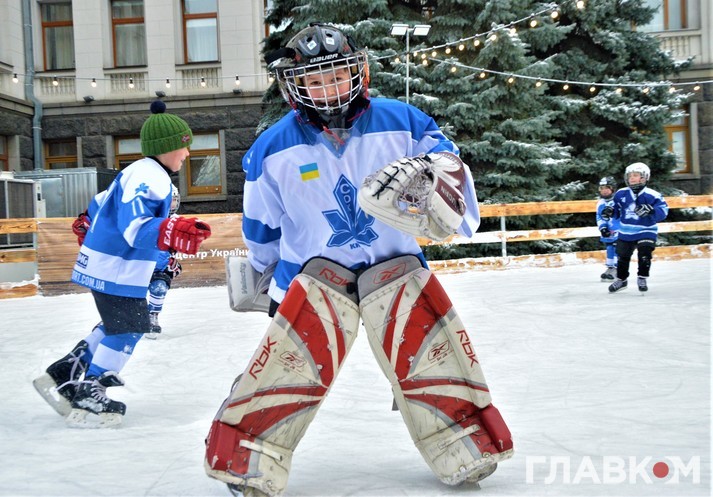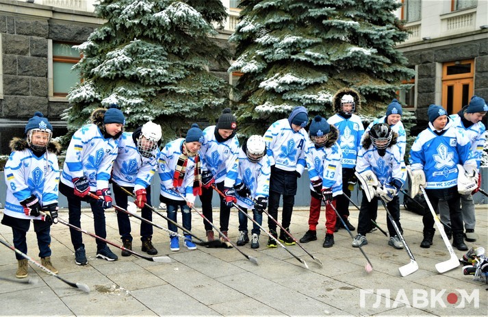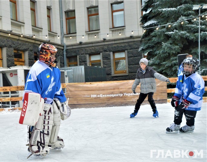 Сьогодні, 5 лютого, під стінами Офісу президента на вулиці Банковій була хокейна атмосфера. Близько двох сотень діточок у светрах київського «Сокола» били ключками по асфальту і каталися на безкоштовній ковзанці.