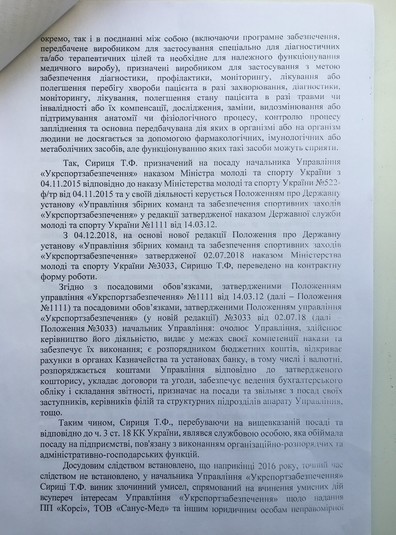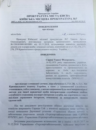 Колишній керівник державної установи управління збірних команд та забезпечення спортивних заходів «Укрспортзабезпечення» Тарас Сириця впродовж кількох років затято боровся з колишнім керівництвом міністерства молоді і спорту на чолі з Ігор Ждановим. Сириця називав міністра і його підлеглих корупціонерами, але тепер сам ризикує отримати це клеймо. Сириці і двом його заступникам, Максимові Дяченку і Михайлові Шендрику, вручені підозри.