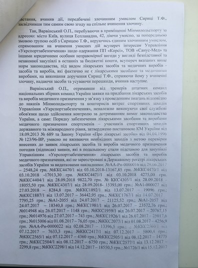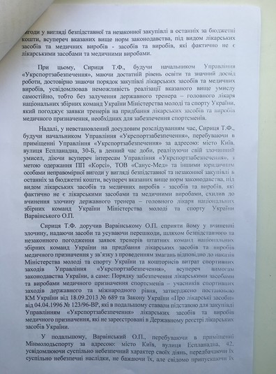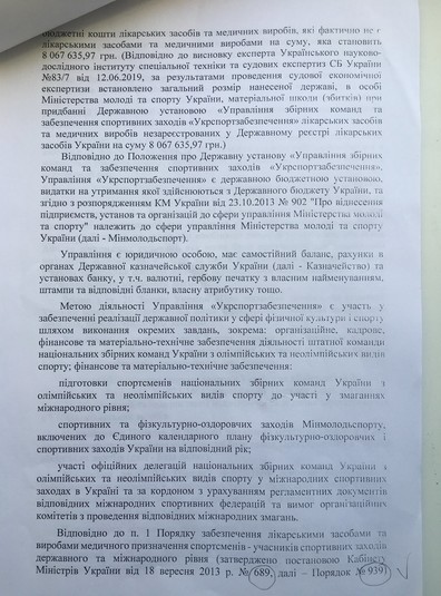 Так чи інакше, після мого звільнення актуальність кримінальної справи проти нас зникла. Проте оскільки вона була порушена, то 22 серпня державному тренерові і головному лікареві були оголошені звинувачення у халатності. І це було начебто логічно, раз мова про БАДи. Однак 5 вересня суд прийняв рішення про моє поновлення на посаді. Після того, наскільки я розумію, у Жданова і Гоцула виникла гостра потреба, щоб замовлення проти мене було доведене до кінця. Як наслідок, через місяць мені і моїм заступникам вручили підозри в корупційному злочині. Мовляв, ми, маючи конкретний задум на користь третіх осіб у вигляді контор-постачальників ліків, здійснили злочин і нанесли державі збитків на 8 млн грн. Мені приписали 4,5 млн, а решту розкидали поміж заступників. Це у зв’язку з тим, що поки мене не було на робочому місці, помічники запускали на проплату те, що було затверджено на торгах.
