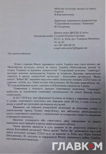 Усвідомлюючи всі ризики і не дочекавшись розуміння з боку заступника міністра, батьки і керівництво ДП вирішили повідомити про те, що відбувається навколо спорткомплексу, керівництво держави. Представники Меморіального центру «Бабин Яр» намагаються знайти компромісні рішення, але спроби знайти компроміс більше схожі на тиск.